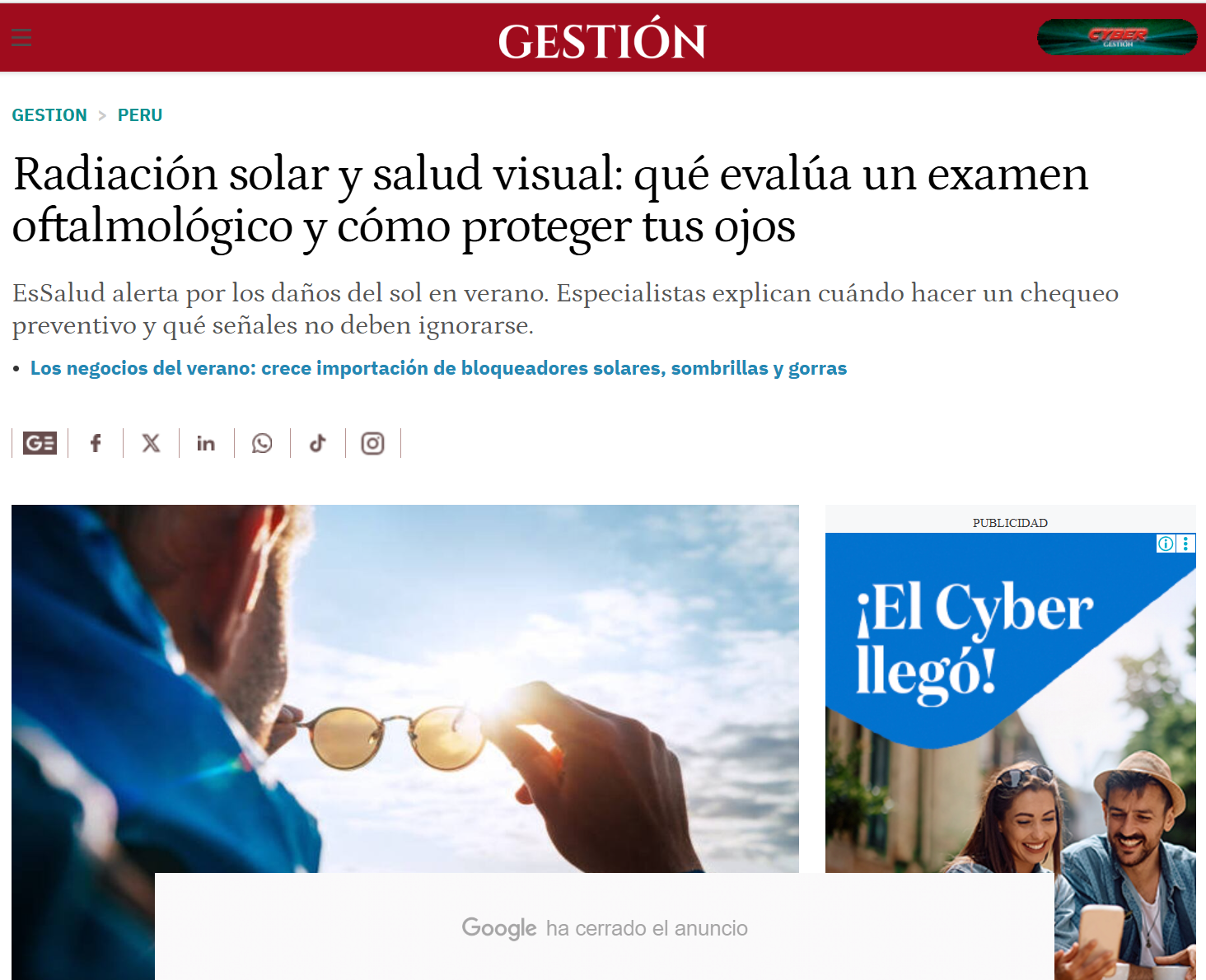 El Seguro Social de Salud (EsSalud) alertó que la exposición a la radiación solar sin protección adecuada puede generar daños en los ojos, algunos de ellos irreversibles.